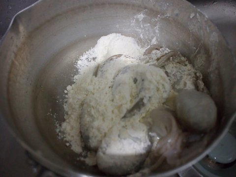 쭈꾸미는 밀가루에 벅벅 빨아서 점액질하고 빨판 정리해줍니다.