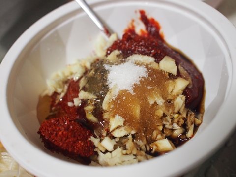 양념은 고추장 3큰술, 고춧가루 2큰술, 다진마늘 2큰술, 설탕 1큰술, 간장 3큰술, 맛술 2큰술, 후추 반스푼.
