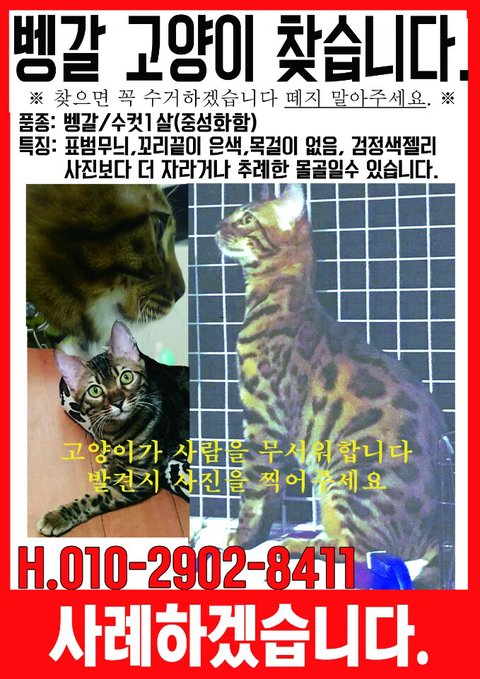 벵갈 고양이 특성상 멀리까지도 갈 수 있다고 합니다.. 며칠 째 생지옥이에요.. 혹시 보신 분이나 보호하고 계신 분 있을까해서 짬날 때마다 여기저기 인터넷 커뮤니티에도 올려보고 있습니다..