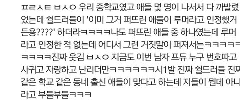 근데 진짜 ㅂㅅㅇ 그중학교에서 좀 그런걸로 유명한거 사실임 진짜 내친구랑 같은 중나왔는데 걍 같은중 나오면 안친해도 그런거 다 알정도 였다함 루머라고 하겠지만 진짜임 ㅠ ㅠ