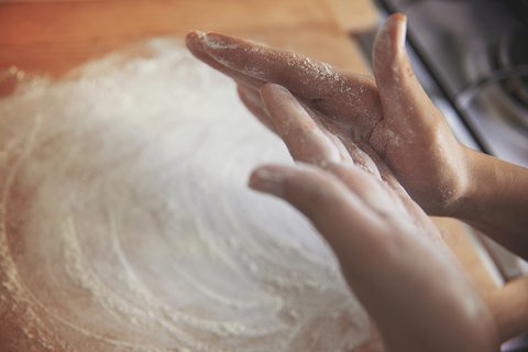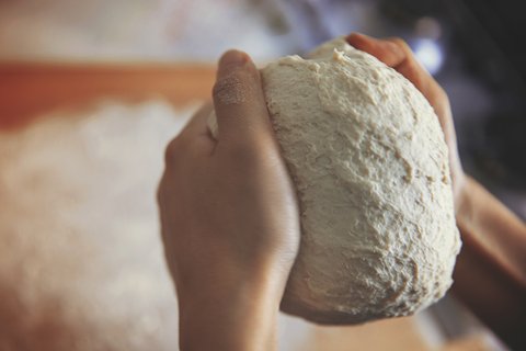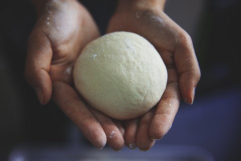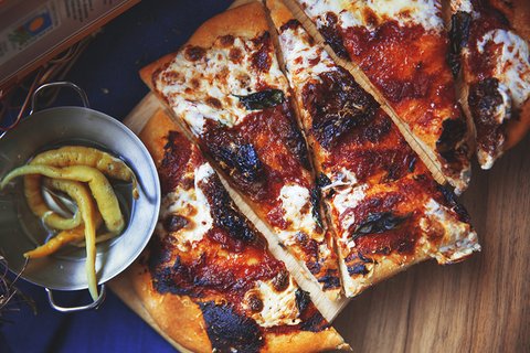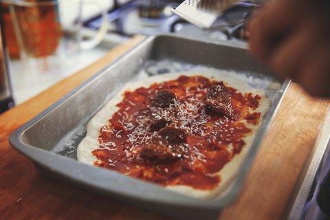 반죽 핀 뒤 조려낸 홀토마토 소스와 태양건조 토마토 그리고 파르미지아노 치즈 솔솔