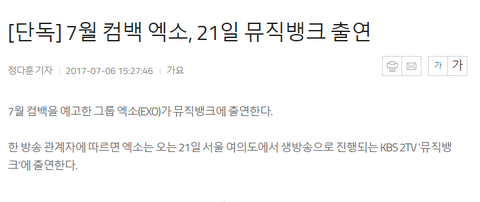 7월 엑소 컴백, 21일 뮤직뱅크 출연