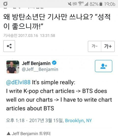 빌보드 200’에서 한국 가수가 6회나 이름을 올리는 것은 방탄소년단이 최초라는 보도가 이어지면서 많은 안티 팬들은 방탄소년단의 성적에 대한 의문을 제기했다. 한 해외 K-pop 팬은 빌보드의 K-pop 전문 칼럼리스트이자 미국 케이블 채널 fuse TV의 기자로 활동하고 있는 ‘Jeff Benjamin’에게 “왜 방탄소년단의 기사만 써주느냐”고 물은 것으로 알려졌다. 그러자 Jeff Benjamin은 “그 이유는 간단하다. 나는 K-pop 분야에 대해 글을 쓰고 있다. 방탄소년단은 우리의 차트에서 성적이 좋다. 그래서 나는 방탄소년단에 대한 차트 기사를 써야만 한다”고 대답했다. 빅히트가 언플?ㅋㅋ오히려 해외팬들이 왜 국내는 조용하다고 난리다 블랙핑크 성적잘나오고 알겠는데 왜 방탄 까내리려하냐 와쥐 한테 기사내달라하던가