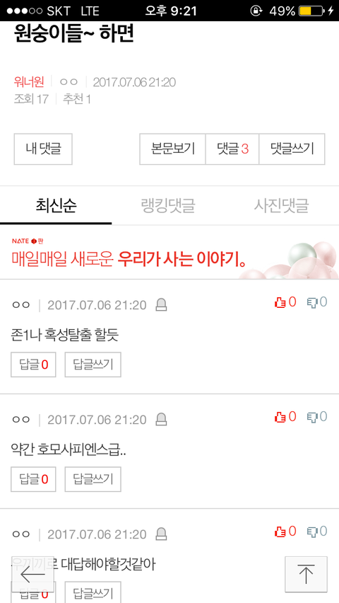 아랫글 쓰닌뎈ㅋㅋㅋㅋ댓글들 ㅋㅋㅋㅋㅋㅋㅋㅋㅋㅋㅋ원숭이는 정말 싫은가보구낰ㅋㅋㅋㅋㅋㅋㅋㅋㅋ이거야말로 한마음 한뜻
