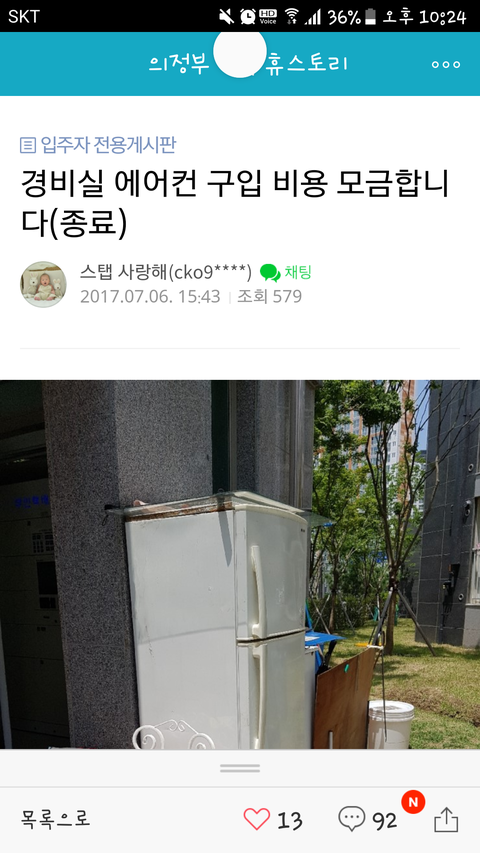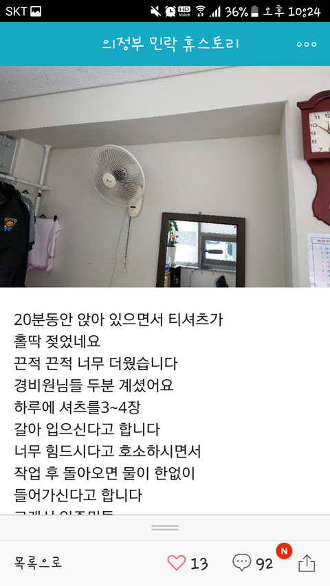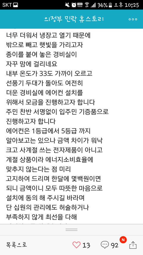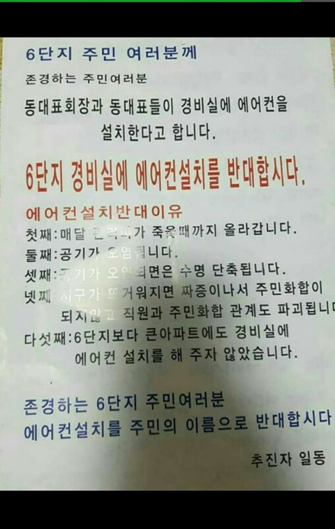 경비실이 너무 더운데 에어컨을 달아드리자는 얘기가 나왔었고