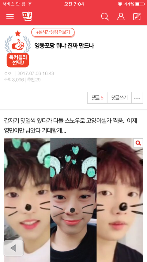 하러러어어어러 하루씩 동현광현세운 고양이 셀카올라왔데......... 이제 영민이만 올라오면 되는데 진짜 영동포팡 유닛하나봐어뜨태ㅠㅠㅠㅠ큐큐ㅠㅠㅠㅠㅠㅠㅠㅠㅠㅠㅠㅠㅠ퓨ㅠ ㅠㅠㅠㅠ 미치겟다 오늘 셤끝나는데 덕질 밤새할 준비 되있다 김칫국 아니겠지?