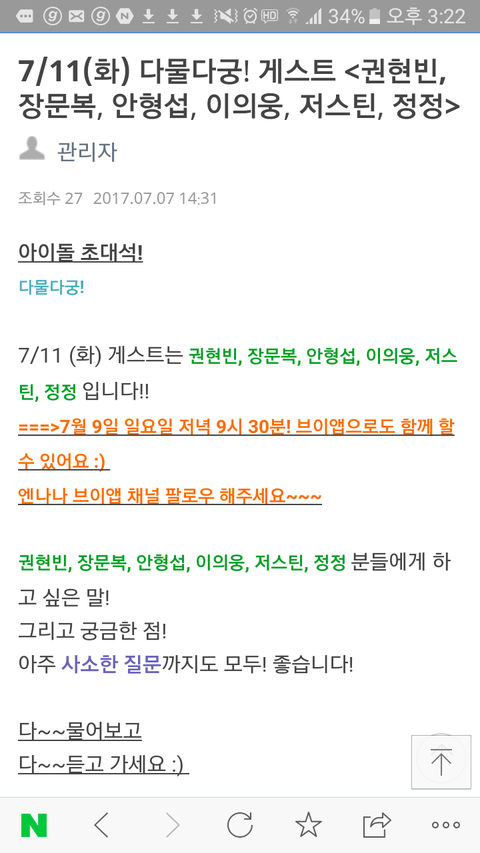7월 9일 일요일 9시 30분에 브이앱으로 녹음방송 생중계 보여준대