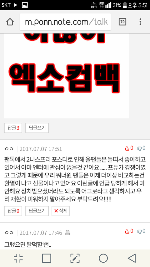 엔터에 이글 글 반대 해주고 댓글 추천좀 해줘!!