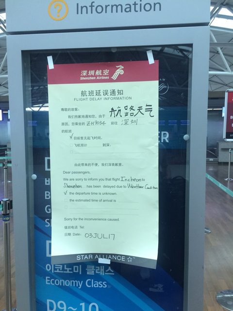 " 기상악화로 인해 출발이 지연 되었음. 출발 시간은 알 수 없음.... 오후 2시에 다시오셈"