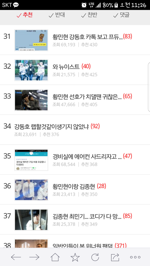 우리가 가는게 아니고 쟤들이 안오는게 문제라니까...ㅠㅠ 여기서 이래봤자 진짜 소용 없고 저기서 괜히 팬톡오라고 고나리질 해봤자 팬코라고 욕먹고. 할 수 있는건 검색순위 내리는것처럼 다른글을 톡선 올리는게 제일이야..... 우리글 톡선 올리는 사람들 그냥 호감가진 머글들이 대부분일거다. 내가 머글출신이라서 대충 알거같아. 팬문화 잘 모르고. 아무리 얘기해도 못알아들어. 팬톡 갈 정도로 좋아하는 건 또 아니고 올라오는 여러 아이돌 보면서 호감가진 애들 글 좋게 올라오면 추천 누르고 가면 끝이야.