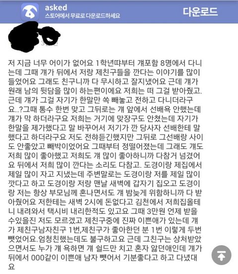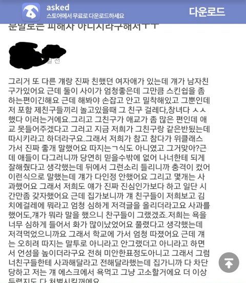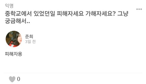 일단 결론은 최준희가 가해자고, 검게 칠해진 친구가 피해자임.(단체로) 그리고 최준희는 피해자 코스프레를 함.근데 이게 이렇게 붉어진 이유가 김천(지역,최준희쪽 친구들)에 있는 최준희 친구들이 이 친구 에스크에 단체로 욕설을 달고 비방을 함. 자세한건 다음 편 계속 이어 올리겠음.