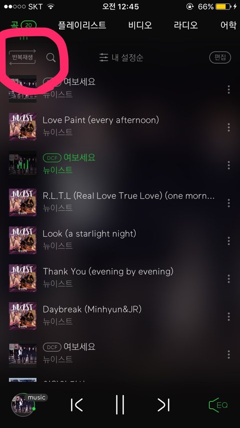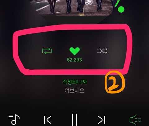 스밍 화면에 (리스트 화면 말고) 2번처럼 전체 반복과 하트를 눌러야해! (셔플 x)