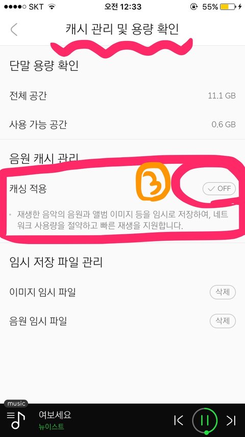 스밍할때 일단, 노래제목 옆에 1번 그림처럼 '음표' 가 있어야해