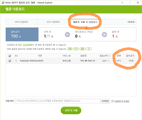 개별곡 구매는 이렇게 곡을 다운받을때 뜨는 팝업 창에서 '개별곡 구매'를 선택하고 결제하면 돼!