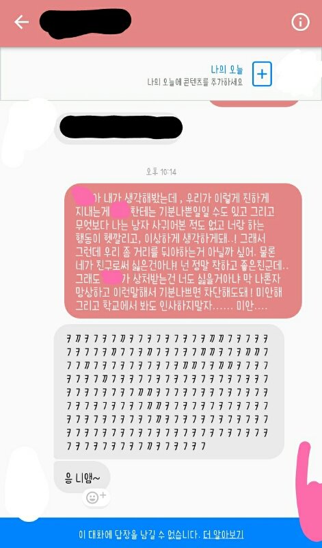 예상했는데, 역시 내가 정말 잘못하고있는거같아 ! 그래서 말을해봤는데 나 지금...좀 당혹스러워 내가 좋아한 남자애가 나한테 이럴줄은 몰랐는데...
