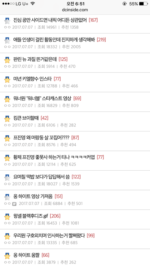 개념글 목록을 보면 윤지성 까는 글 외엔 아주 클린-함 다들 찬양하는 글밖에 없어