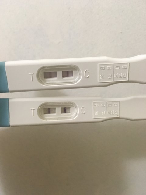 저번달 중후반에 생리를 했어야 하는데 여태 안하고 체온이 늘 높고 속이 안 좋아서 어제 오늘 임신테스트 해보니 둘 다 두줄이 뜨네요..