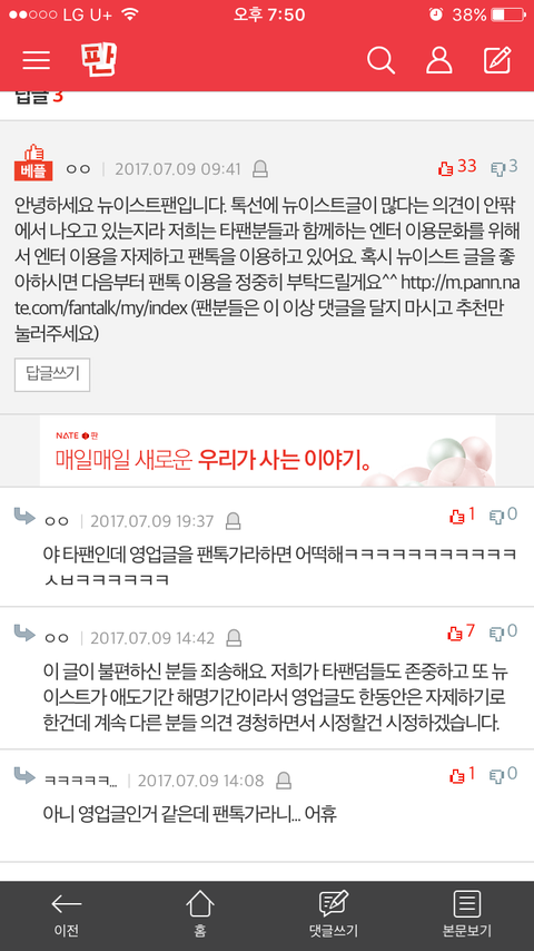 ㅇㅌㅌ에 영업글같은거 올라오잖아 근데 거기에 팬톡으로 와주라는 댓글잇으면 타팬분들이 고나리 심하다고 자기들도 재밋는 글좀 보자라고 말하잖아 근데 또 다른 사람들은 팬톡가라고 하는 사람들도 있고