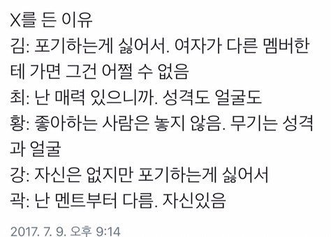 멤버들이 한 여자를 동시에 사랑하는데 포기할거냐 말거냐고 물어봤는데 멤버들 다 x 듬