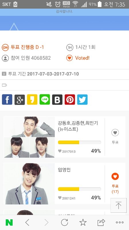 오늘 메이크스타 영민이 투표 마지막날이야 아직 2위니깐 투표 많이 해주세요ㅠㅠㅠㅠㅠ 네이버에 메이크스타 검색하면 됩니당! 회원가입도 간단하고 1시간에 한번씩 가능하니깐 시간날때마다 꼭 해주라ㅠㅠㅠ 부탁할게요