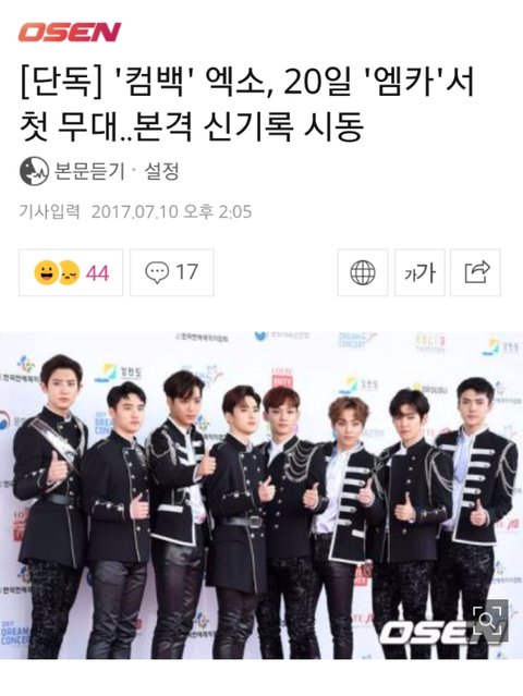 [단독] '컴백' 엑소, 20일 '엠카'서 첫 무대..본격 신기록 시동 (출처 : OSEN | 네이버 TV연예)