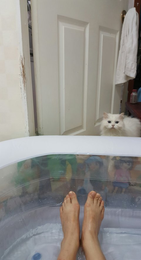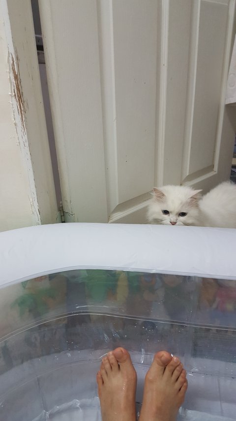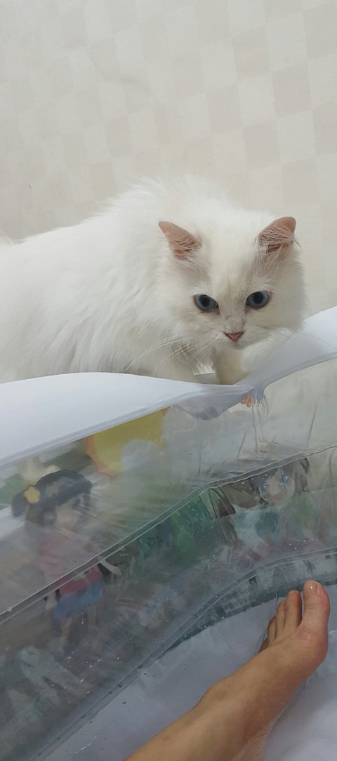 가까이 들여다본 고양이는 깜짝 놀라고 말아습니다.