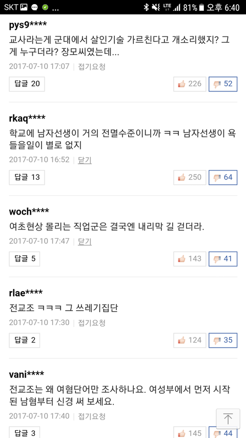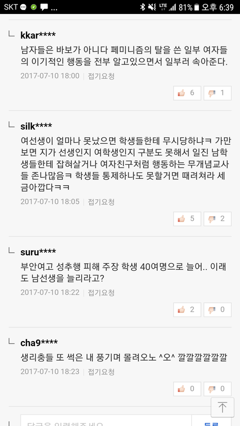 교사 자리가 남자들이 취직할때 남자라고 꿀빨듯이 얻은 자리인가요? 정정당당하게 수능보고 들어간 학교 아니던가요?