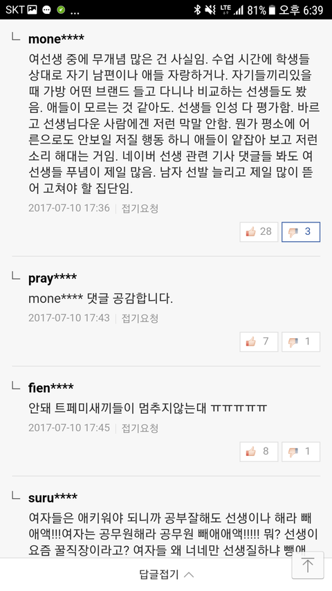 리플들의 내용은 여교사의 무능함을 지적하는 내용들입니다