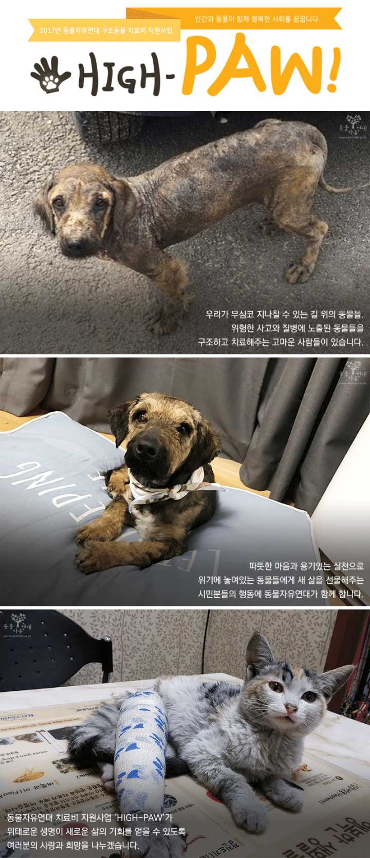 도로 위를 달리던 수많은 차량들의 수만큼 차가운 외면을 당했던 강아지를 두고 떠날 수 없었습니다. 한 생명을 살리고픈 간절함으로 강아지의 수술부터 임시보호까지 최선을 다해 노력하는 모습에 동물자유연대도 치료비 지원으로 도움을 드렸답니다. 모두가 외면하던 강아지는 '럭키'라는 멋진 이름도 갖게 되었습니다. 구조자의 적극적인 구조로 위태로웠던 한 생명이 새로운 삶의 기회를 얻게 된 것이지요.2017년, 새롭게 시작하는 유기동물 지원사업을 응원해주세요강아지 '럭키'를 구조해주신 구조자처럼 어려움에 처한 동물들을 외면하지 않는 시민들의 적극적인 참여가 동물보호활동에 큰 힘이 되고 있습니다. 하지만 한 개인이 부담하기에는 부담스러운 수술비와 치료비 등 현실의 벽은 높기만 합니다. 2017년 새롭게 시작하는 구조동물 치료비 지원 사업 'HIGH-PAW'는 비용부담으로 인해 도움의 손길을 내밀지 못하는 시민들과 그로 인해 새 삶의 기회를 얻지 못하는 동물들을 위한 배분사업입니다. 그리고 전국의 각 지역에서 유기동물 입양활동을 하는 풀뿌리 단체들을 위한 지원사업이 올해 처음 시작됩니다. 유기동물보호소에서 공고기간이 끝난 동물들을 보호하고, 입양 가정을 찾기 위한 노력을 하는 소규모 단체들을 위한 '2017 동물자유연대 풀뿌리 지원사업'도 지켜봐주세요!