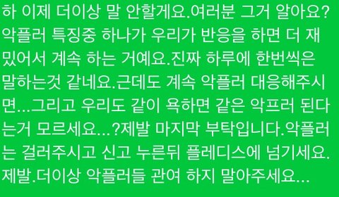 악플러한테 일일이 대응하는 캐럿들 있으면 봐주라.제발 악플러들한테 대응 해주지마...나 그런 캐럿들 볼때마다 속터지고 화나...그냥 악플러는 속상하고 화나도 조용히 거르고 신고하고 플레디스에 보내면돼...