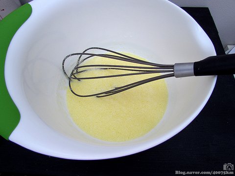 버터 1/4컵은 녹여서 붓고, 여기에 우유 한 컵과 달걀 한 개를 풀어서 거품기로 잘 저으면 됩니다.