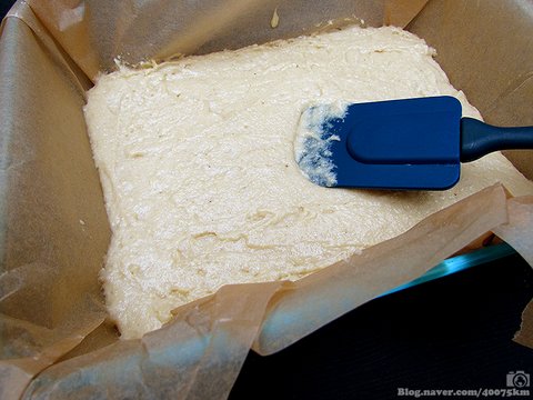 깊이가 있는 오븐용 사각팬에 베이킹 시트지를 깔고 반죽을 채웁니다.