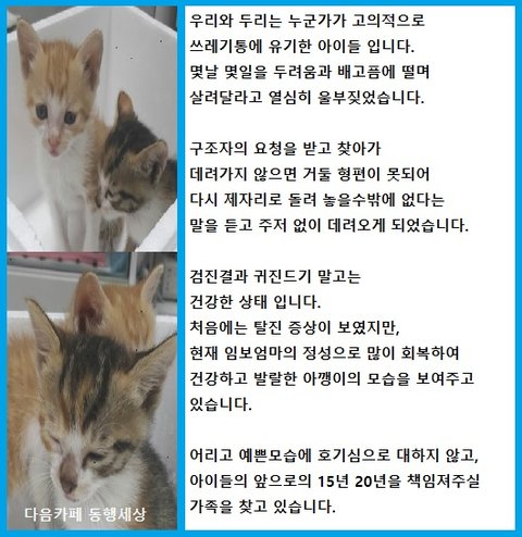 우리와 두리는 누군가가 고의적으로 쓰레기통에 유기한 아이들 입니다.