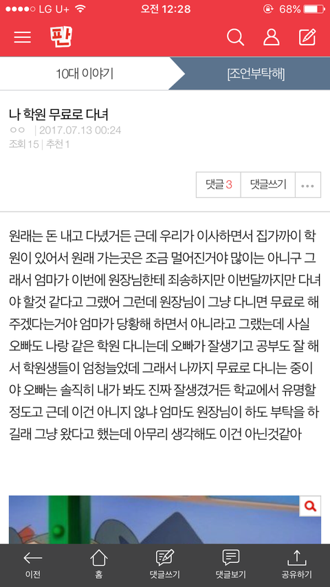 글내용이 오빠 때문에 공짜로 학원다니다는 내용 저 영상 똑같은내용임ㅠㅠ한마디로 쓰니 저 영상보고 허언증걸려서 글올림ㅠㅠ