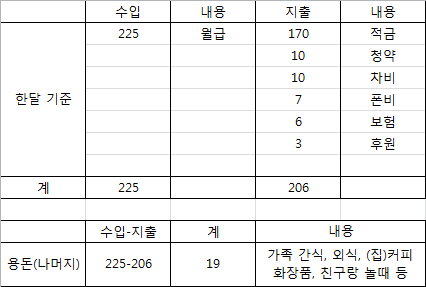세후 대충 225만(7만 xxxx원이지만 귀찮으니 5만으로 끊음), 외 정기 지출은 보다시피...
