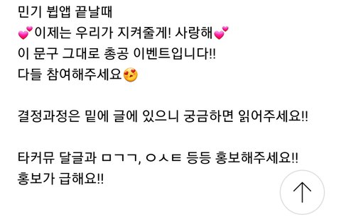 이벤트 내용은 민기가 가위앱을 이제 마친다고 하면 모두 댓글로 문구를 통일해서 감동을 주자는 의미야ㅎㅎ 모두 함께해서 민기에게 감동을 줘보쟈! 아 그리고 가위앱 닉네임 앞뒤로 토끼 이모티콘을 붙이는 것도 하더라구 이것두 함께해주면 민기 감동은 배가 될 것 같당!