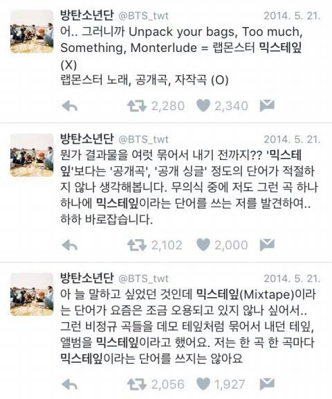흠흠 남주니말을 참고해서 이제까지 나온 곡 중에 믹스테잎은 주니의 RM과 윤기의 어거스트디밖에 없어! 그러니까 위돈톡 본싱어 네시 등등 다 커버곡, 공개곡이야 알게찌???
