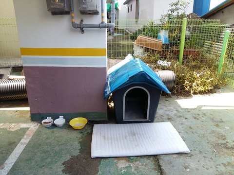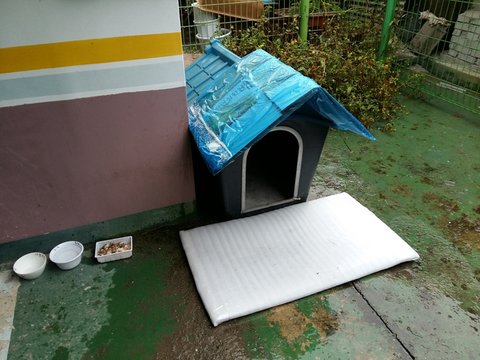 집도 없이 생활하는 큰멍멍이가 안쓰러워서 근처에 놀고있는 개집을 렌탈해서 ,