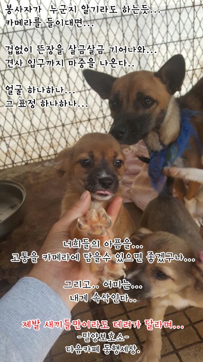 임시보호처로인해 구조의 손길이 필요한 아이 한마리라도 더 살릴수 있고 나의 실천으로 다시 새로 운 삶을 살수있다는것을 잊지 말아주
