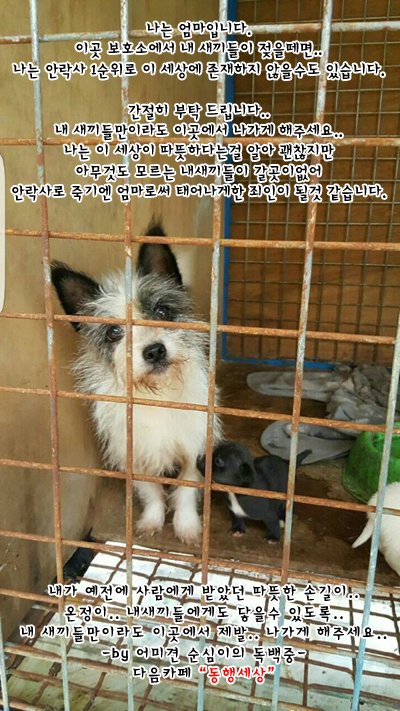지금도 수많은 유기동물들이 가족에게 버려져 10일후 안락사가있는 시보호소나 눈에 띄지 않는한 절대 나올수없는 사설보호소에서 가족