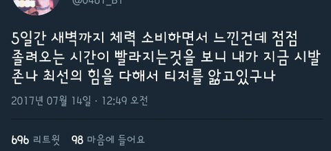 나 첫티져때 밤샜는데 점점 일찍자다 열이때10시에자고 어제 초저녁7시에잠ㅋㅋㅋㅋㅋㅋㅋㅋ시바 오늘도 조카졸려......
