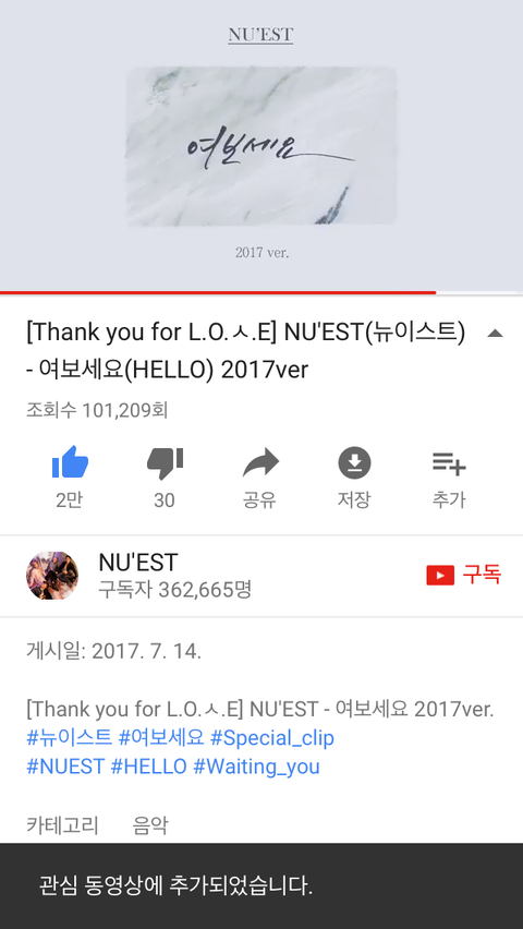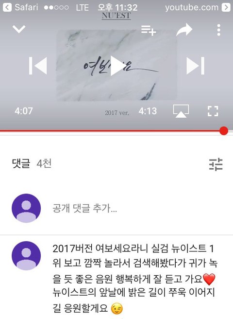 뉴이스트가 1위 실검뜬거 보고 앗 혹시 혹시? 하고 들어가봤더니 드디어 새 음원이 발표된걸 보고 당장 유튜브로 달려가 2017 여보세요 듣고 왔습니다! 여보세요 노래가 너무 좋아 자주 들었었는데 2017버전도 정말로 듣는 귀가 황홀할만큼 좋네요:3