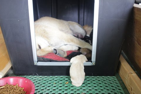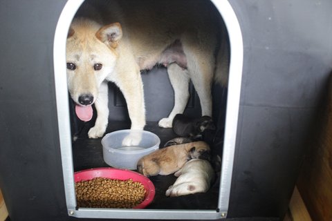 큰멍멍이는 잘 들어가지도 않던 개집에서 새끼를 출산하고 있었습니다.