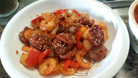 새우랑 파프리카랑 양파랑 케찹 등등 양념 넣고 볶은 새우 쏘야 볶음입니다>_<