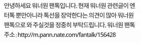 1.글자체가 딱 워너원이랑 워너블 까는 내용 (예를 들면) 워너블 얘네들은 워너원이 국민 대보이그룹인줄 착각한다 현실은 대중들은 워너원에게 아무런관심 없다 이런글은