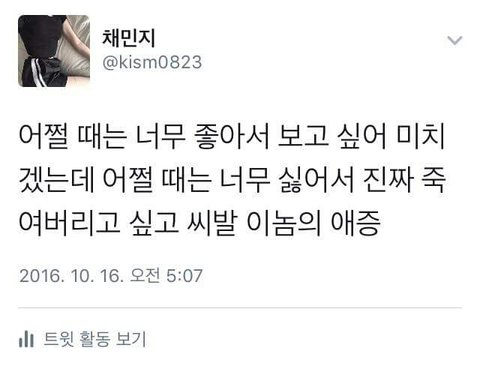 제목 그대로 좋아하는 사람이 뭐할때 정떨어져 ? 나는 내가 좋아하는애가 막 욕하고 뭘 해도 걔한테 콩깍지 제대로 씌여서 이제 웬만한걸로는 아무렇지도 않아 너무 좋아해서 너무 힘들어 ㅜㅠㅜㅠㅠㅜㅠ