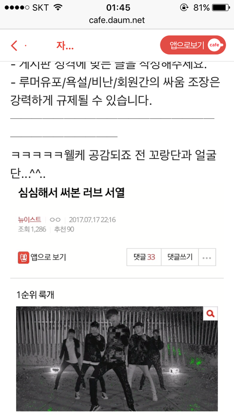 ㄱㅋ랑 판 둘 다 하는데 나처럼 최소 2개 정도씩 하는 러브들 많은듯! 요즘 양쪽에 글 올라 오는것 보면, 기사╋정보╋짤 꽤 비슷한 속도/시점에 올라오고. ㄱㅋ에 글 쓴 러브가 똑같은거 판에도 쓰거나, 판에 쓴 러브가 똑같은거 ㄱㅋ에 쓰기도 하고. 양쪽다 서로 글/짤 퍼오는 경우 꽤 보임. 그냥 차이점은 아무래도 ㄱㅋ는 규칙도 좀 까다롭고 존대가 기본이라, 판이 사담이나 개인 의견 나누는게 좀 더 많고, ㄱㅋ는 정보공유/짤/직찍/포샵한 영상/등등 팩트 기반 글이 더 많은 딱 고정도 차이.