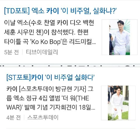 카이 평소에도 잘생겼는데 오늘은 진짜 대박잘생겼더라 기자들도 놀랐는지 기사제목들이 다 이럼ㅋㅋㅋ