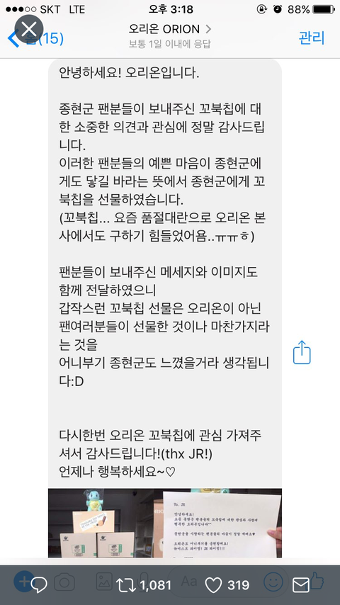 ㅇㄹㅇ이 종현이한테 꼬북ㅊ 선물했대