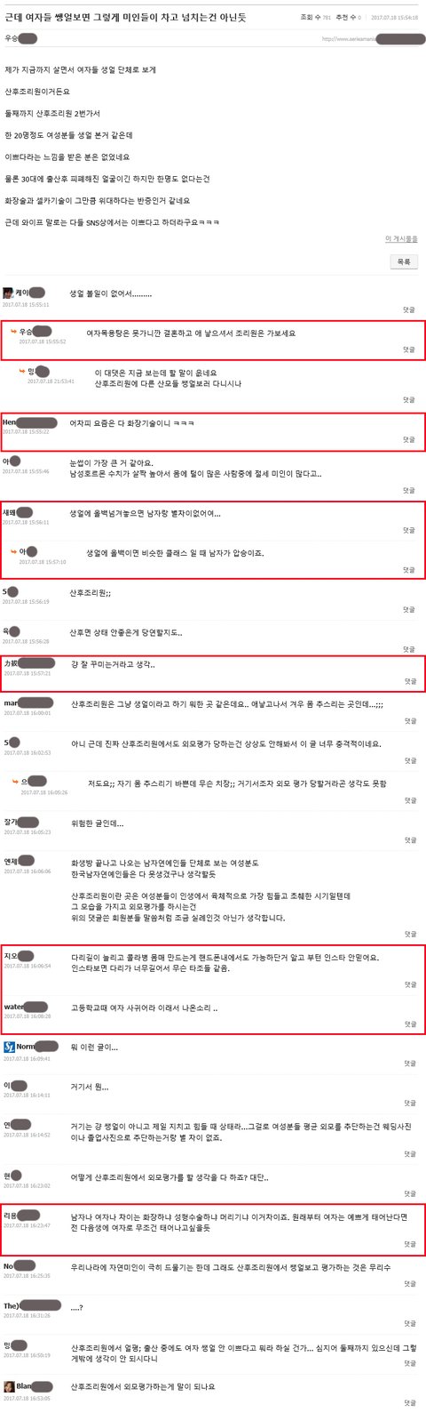 아무리 한국사회가 TPO 상관없이 여성의 얼굴을 대놓고 평가질하는데 관대하더라도 산후조리원에서 산모 얼평이라니 정말 할말을 잃었네요 ~~